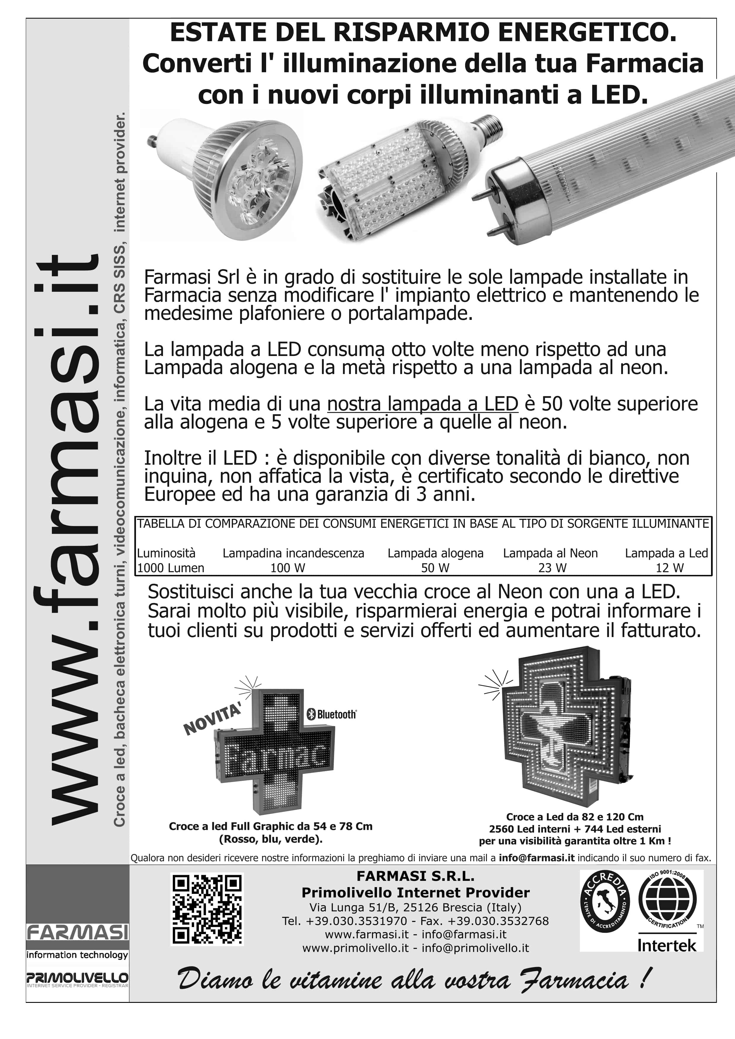Quest’estate Farmasi promuove la sostituzione delle lampade alogene o al neon con le nuove lampade a Led che consentono grandissimo risparmio energetico e ritorno dell’investimento in tempi brevissimi.